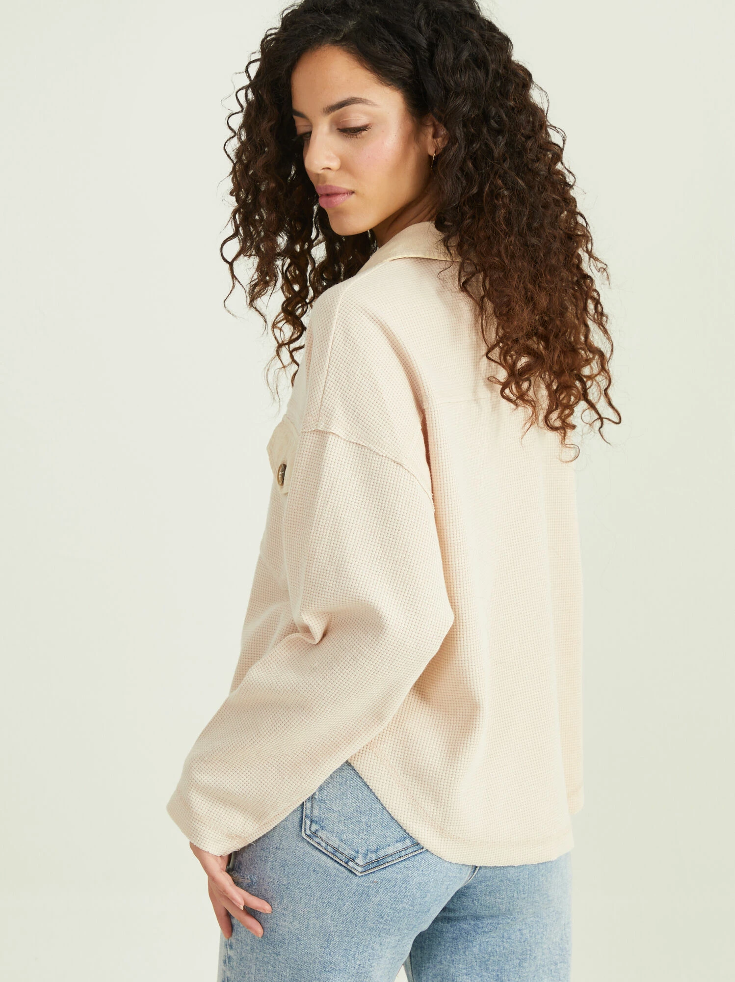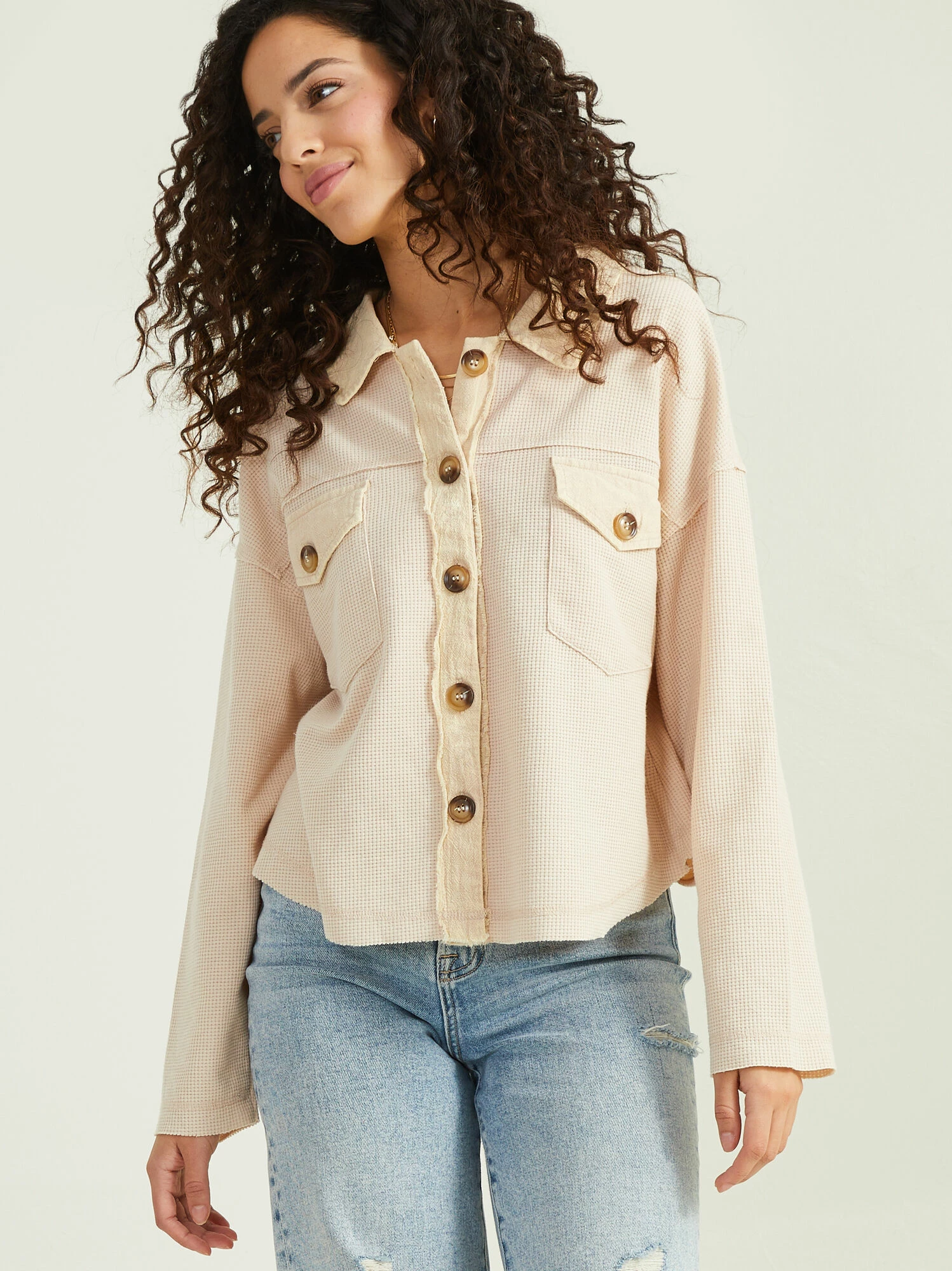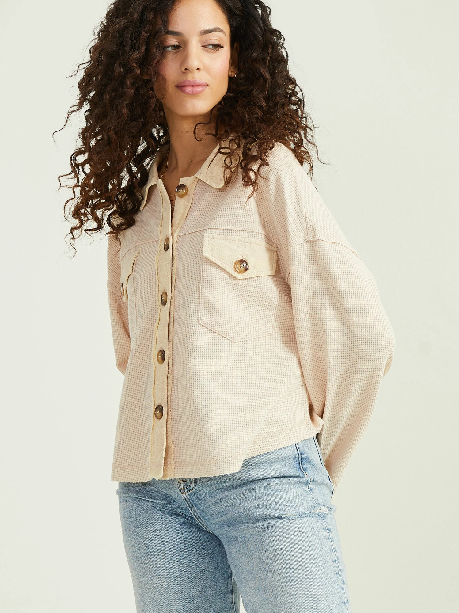 We are loving the cozy vibes of the Aliyah Thermal Button Up! This washed top features a waffle knit texture with two front pockets. This lightweight is perfect for throwing on over any basic top, it makes a perfect transition piece into the warmer months.