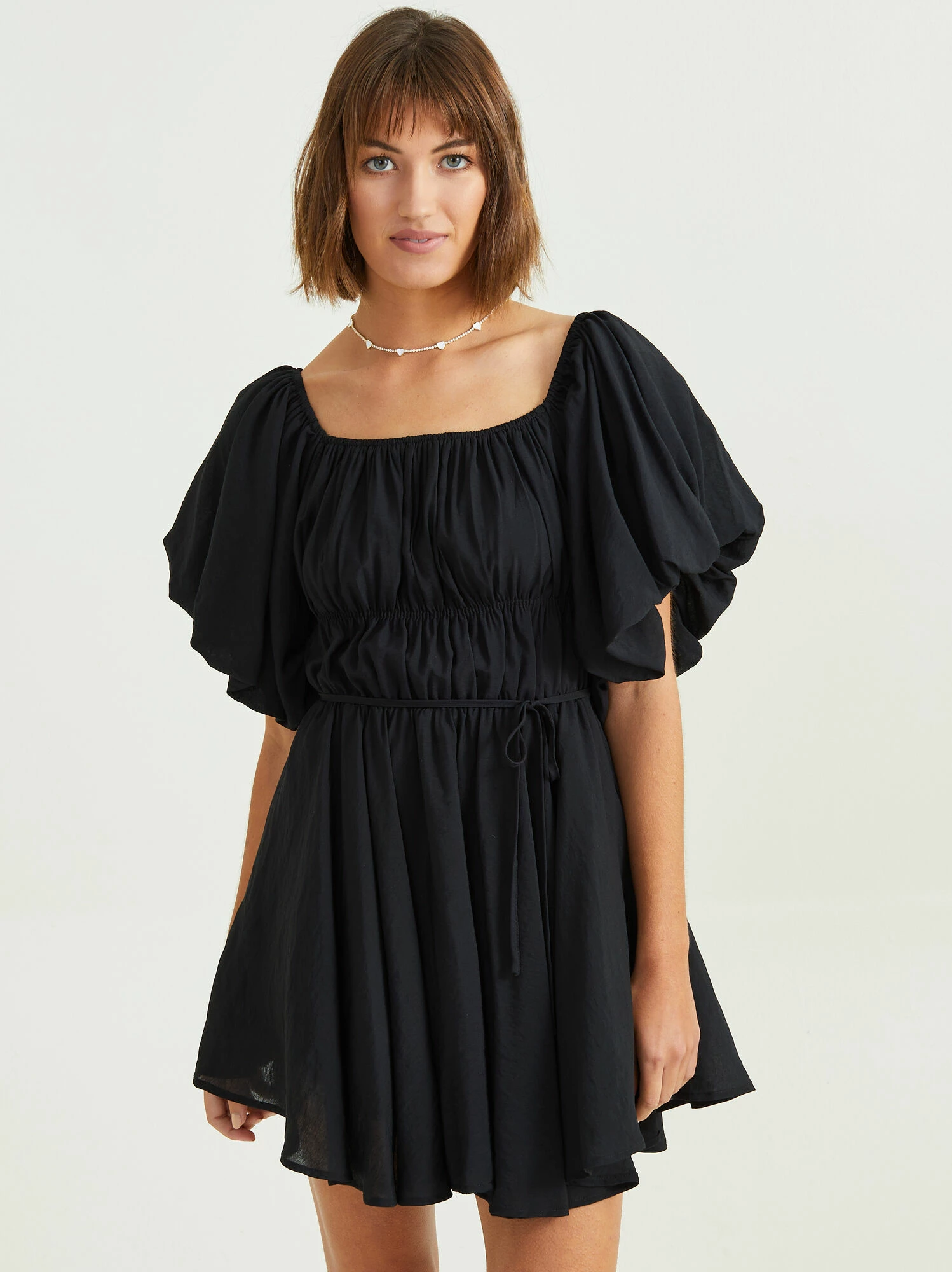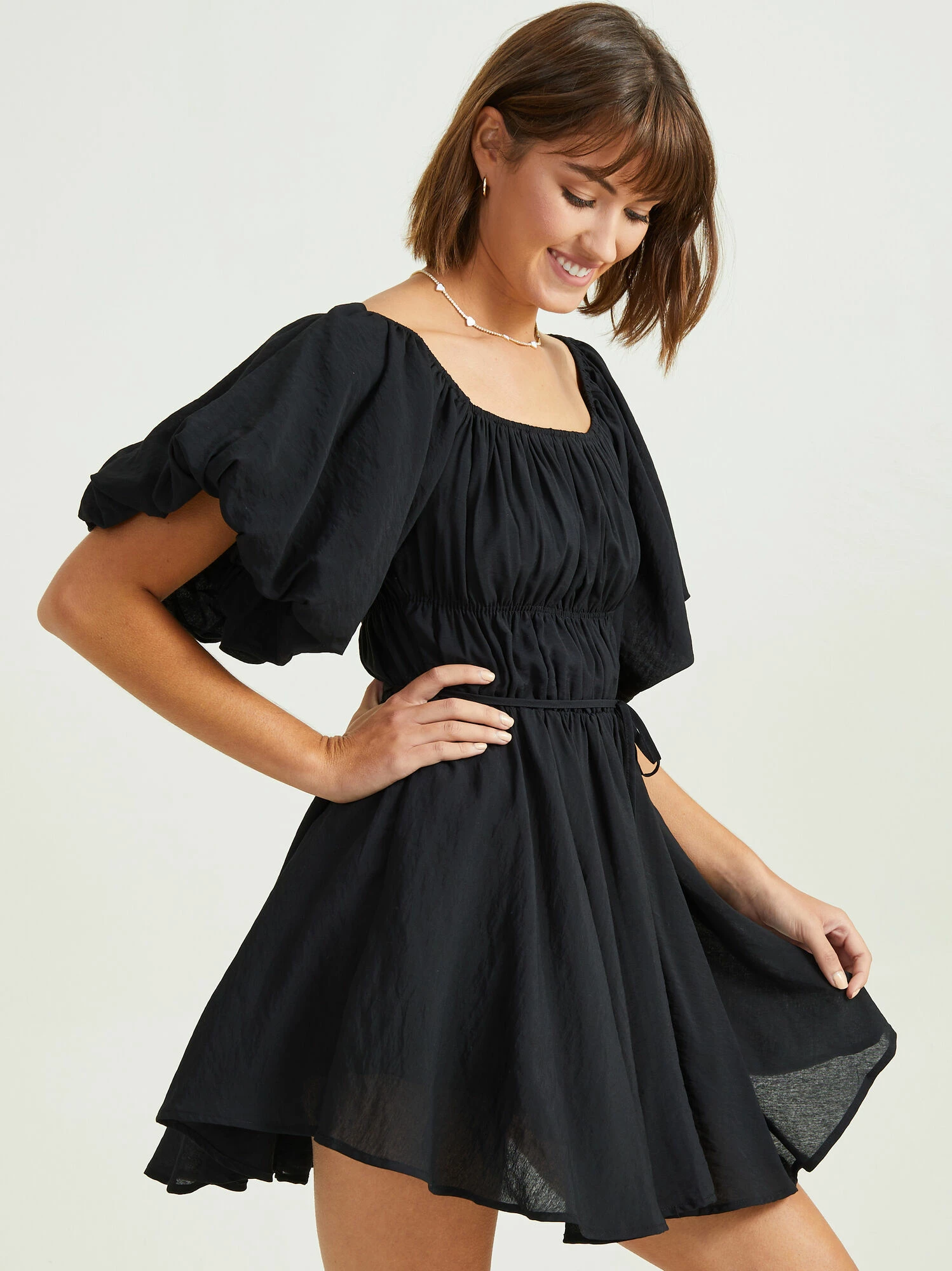 ONLINE EXCLUSIVE// Spring forward in this adorable, ultra-flattering mini dress! The puff sleeves add a feminine touch, and the ruching and ruffles are a timeless style! Pair with your favorite nude or white heels and you have a full, bright look!