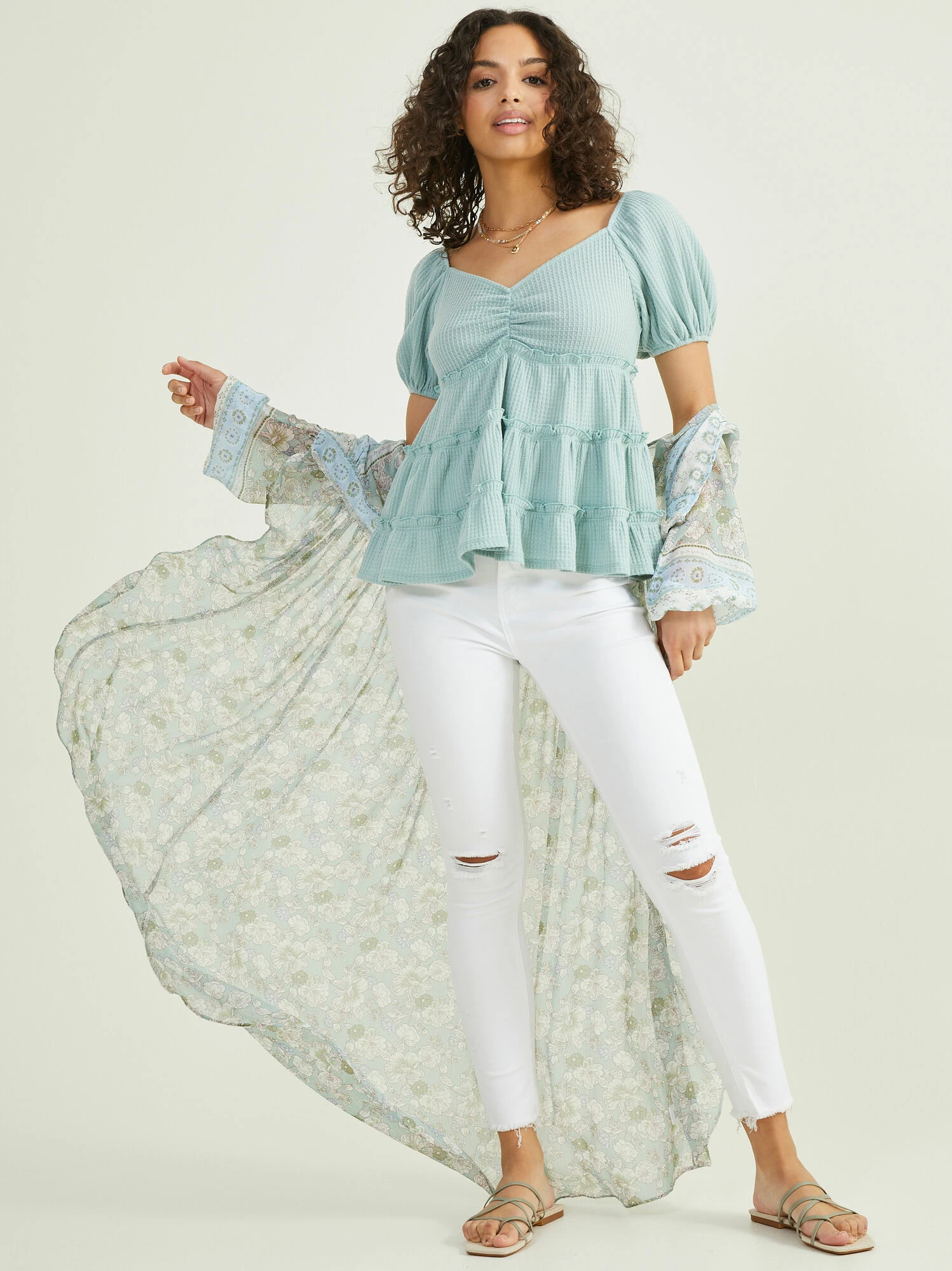 The Amelia top features an ultra soft waffle knit texture throughout and is a perfect basic to have on hand! The puff sleeves and tiered ruffles give this top a dainty feminine look and the cinched sweetheart neckline allows for a super flattering fit. Pair this top with some distressed denim and sandals for a cute daytime look!
