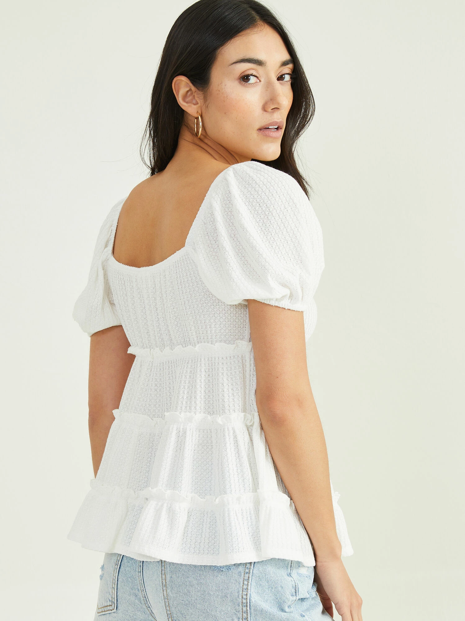 The Amelia top features an ultra soft waffle knit texture throughout and is a perfect basic to have on hand! The puff sleeves and tiered ruffles give this top a dainty feminine look and the cinched sweetheart neckline allows for a super flattering fit. Pair this top with some distressed denim and sandals for a cute daytime look!