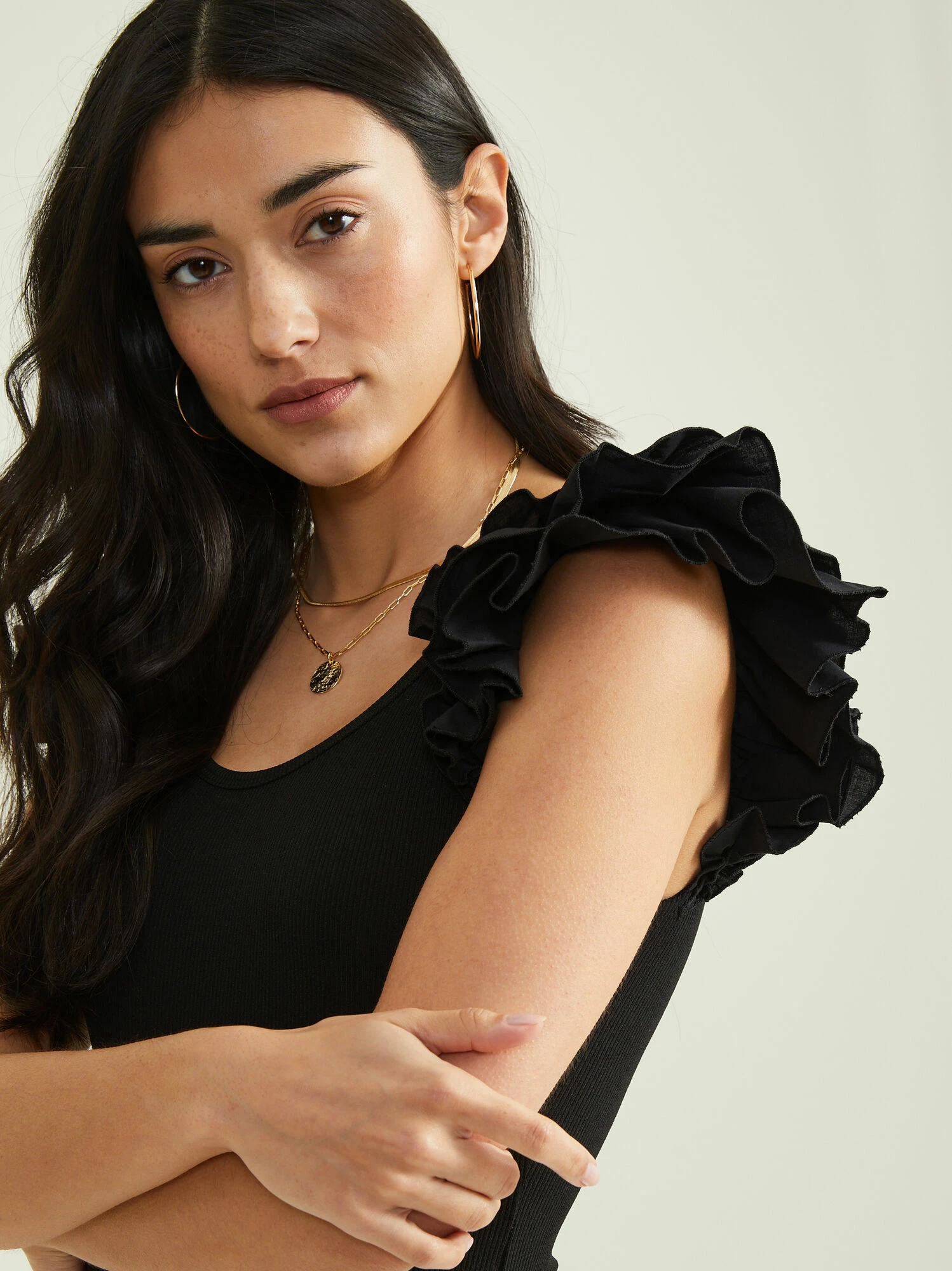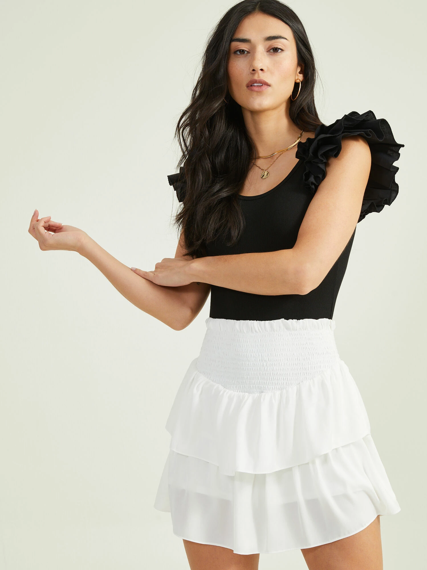 The Bonnie Ruffle Sleeve Bodysuit will make a timeless addition to your closet. This super soft ribbed bodysuit features three layers of ruffle sleeves. The bodysuit has a great stretch for added comfort. Style this with jeans, shorts, or a skirt- the styling possibilities are endless!