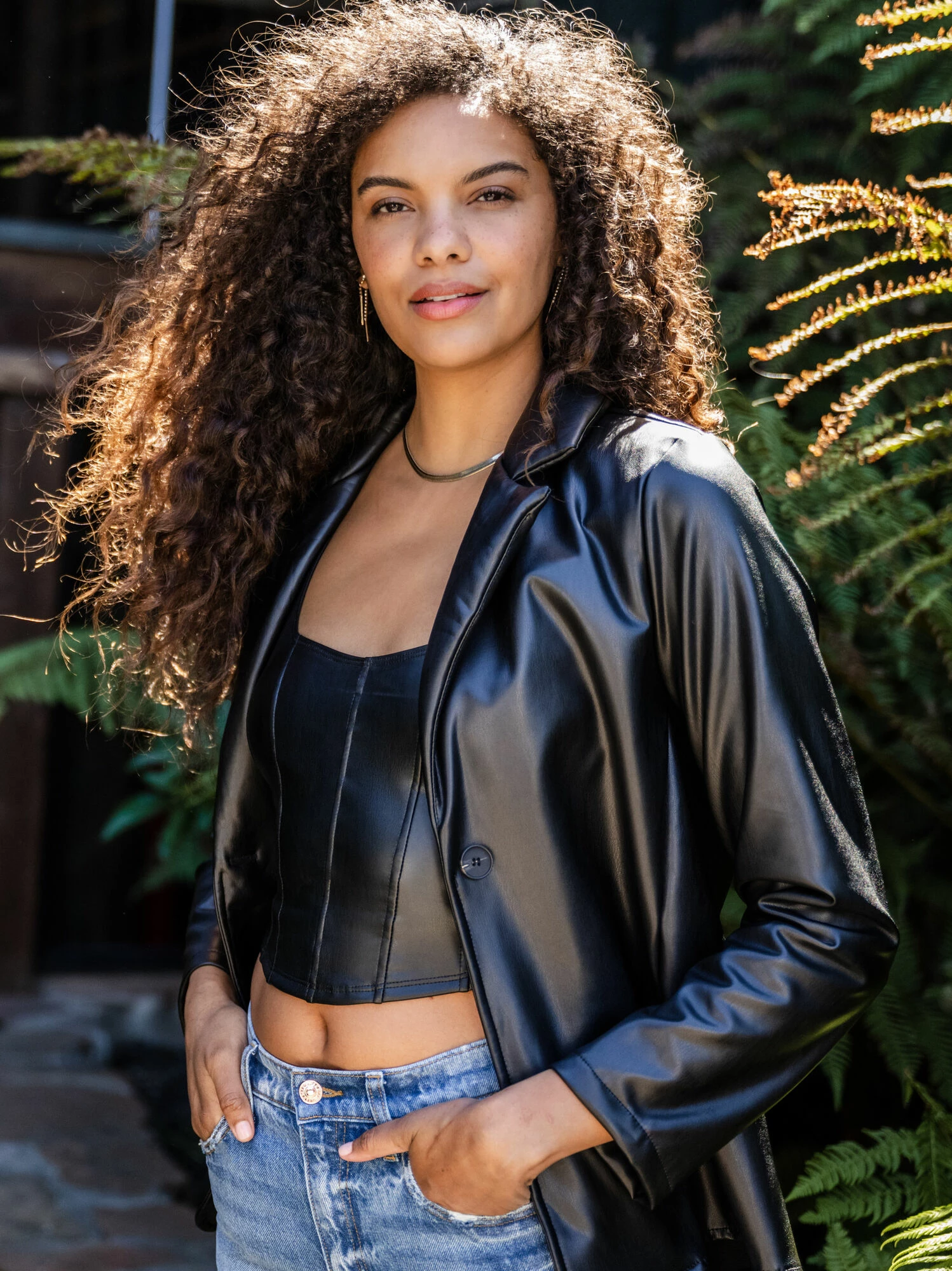 Stay trendy in this sleek and sophisticated vegan leather crop corset tank! The corset design is so fashionable, especially if you layer it under a blazer and pair it with a tall boot or heel. Check out the Brooklyn Skirt to complete the matching set.