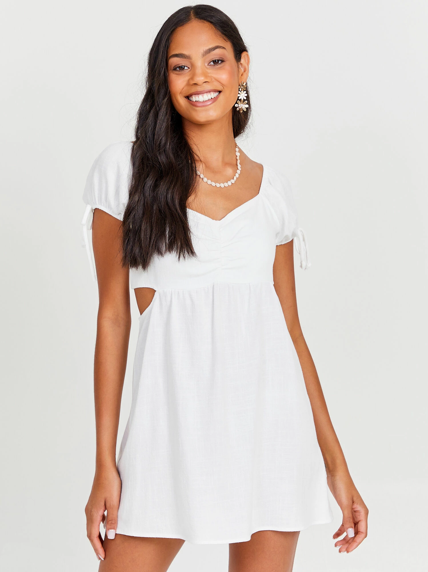 This dress features a beautiful babydoll silhouette, bright white color, and dainty details that make it special. the cutout details add a fun touch for spring!