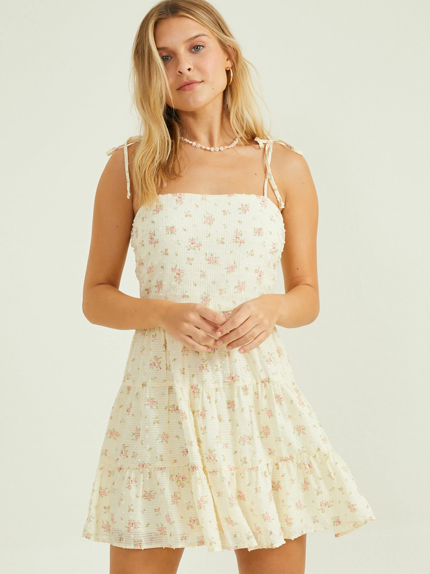 This floral clipdot mini dress is nothing but cuteness all-over! The tie shoulder straps and tiered skirt make this dress the perfect transitional piece for spring. Pair with a cardigan when it’s chillier and cool down with your favorite strappy flat sandals!