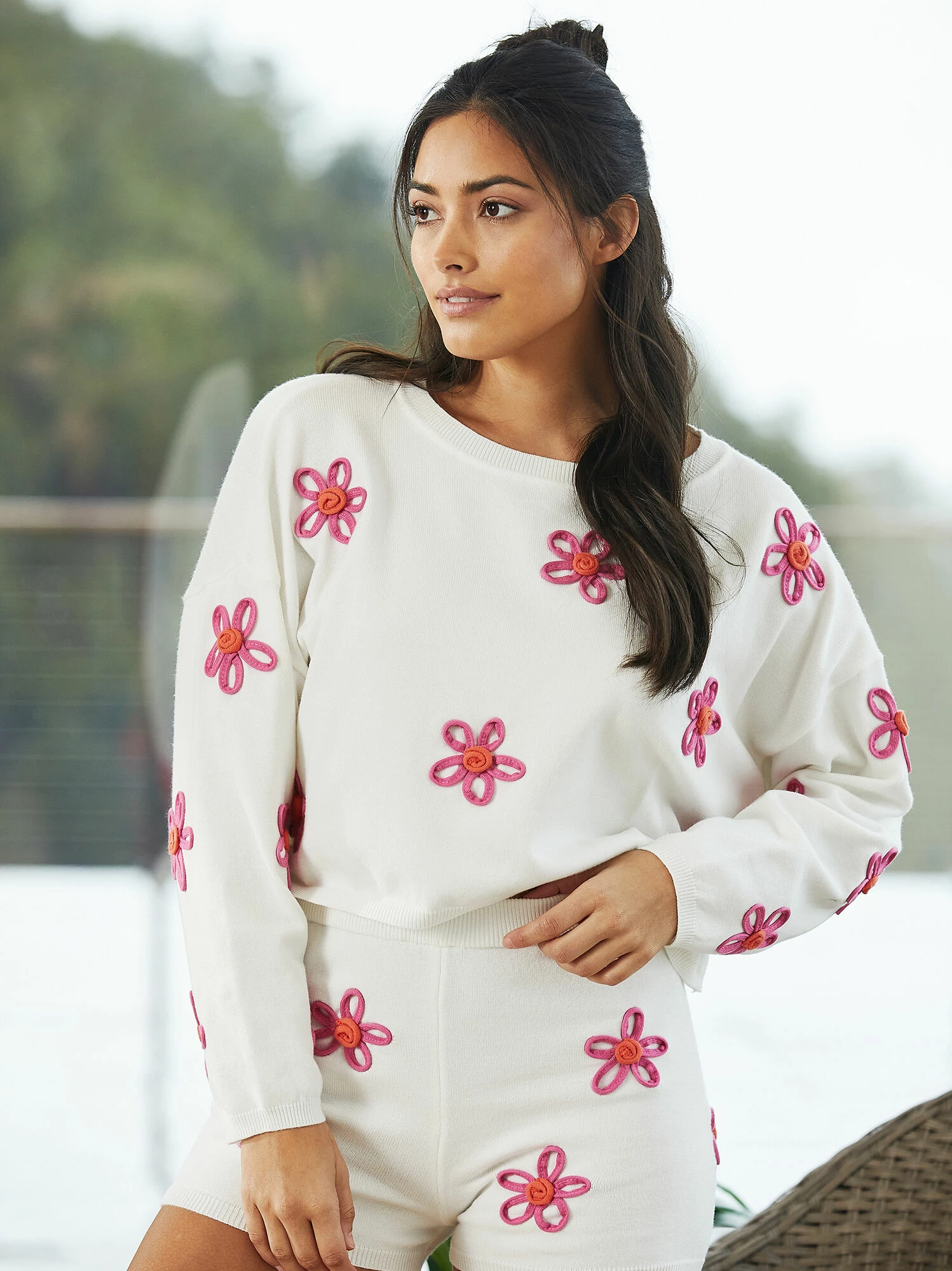 Feel fun in floral with these cozy lounge shorts featuring beautifully stitched flowers and a stretchy ribbed waistband to maximize comfort. You will love pairing these with the matching Flower Stitch Sweater for the cutest comfy set!