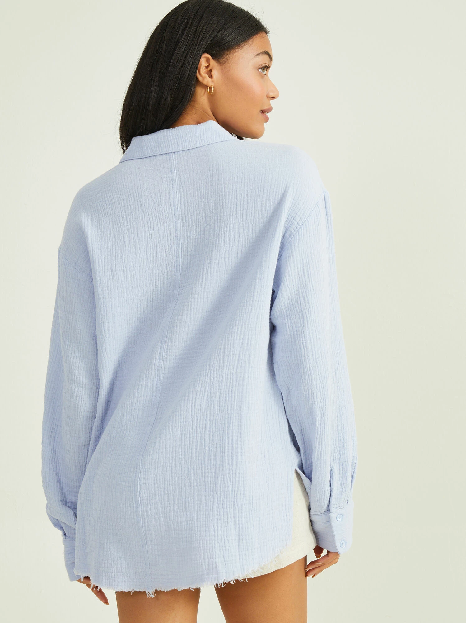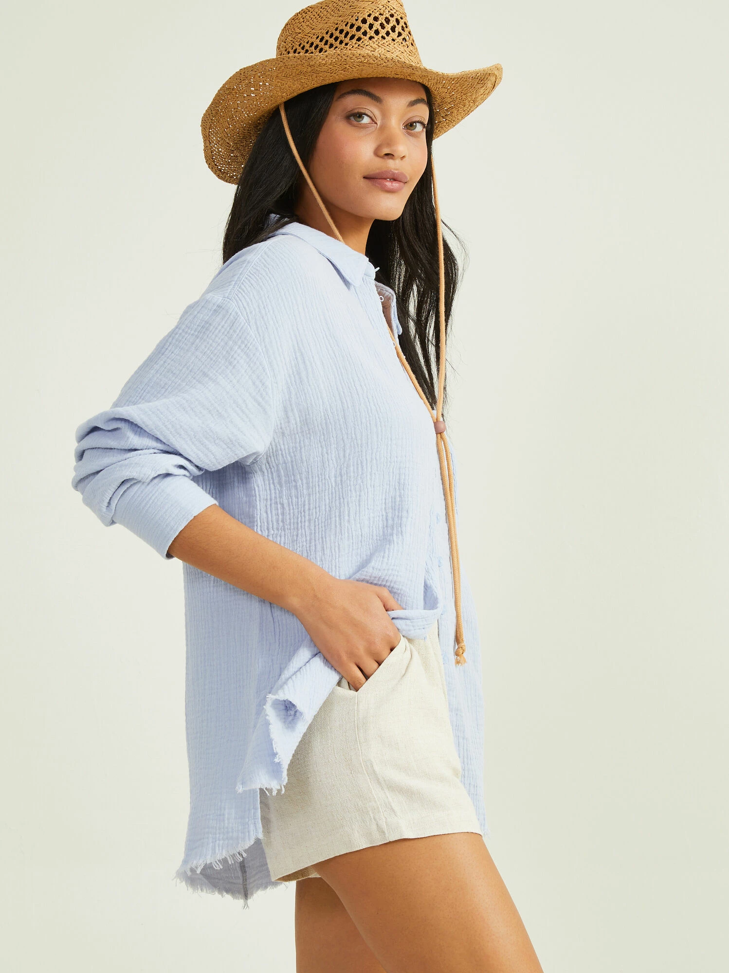Say hello to your new favorite layering piece! The Hannah Bubble Gauze Button Down has a beachy, lightweight fabric and raw hem detailing that has us dreaming of warm weather and sunshine. Button up and wear the top on its own or leave it open and throw a fun graphic tee underneath. The possibilities are endless- have fun with it!