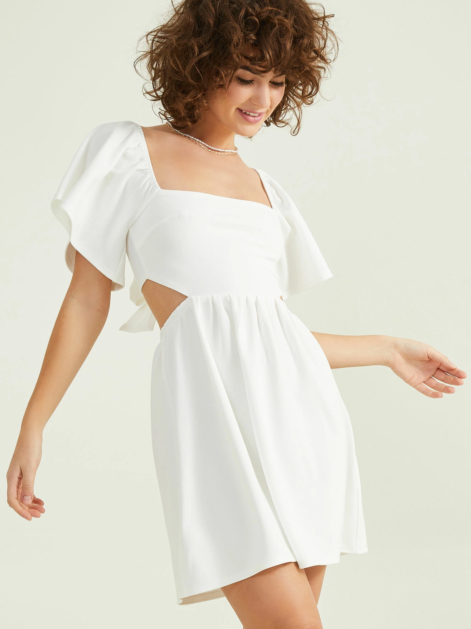 The Holland dress is full of eye-catching details that a sure to make you stand out! This dress features an open back with bow-back detailing and flutter sleeves for an adorable feminine look! With an elastic waist skirt and sleeves, this dress will fit to you perfectly for a flattering fit & flare style. Pair this dress with your favorite heels and some dainty jewelry to complete the look!