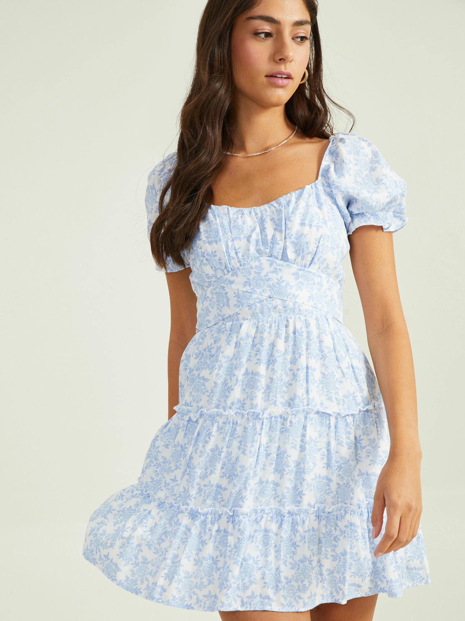 You will absolutely love this floral mini dress’s delicate, feminine look that is perfect to add to your closet for Spring! The trendy puff sleeves, the tiered ruffled skirt, and the crossover tied waist make for an adorable warm-weather piece. This sweet little lightweight dress is perfect to pair with white heels and dazzling jewelry for a showstopping look at your next outdoor event.