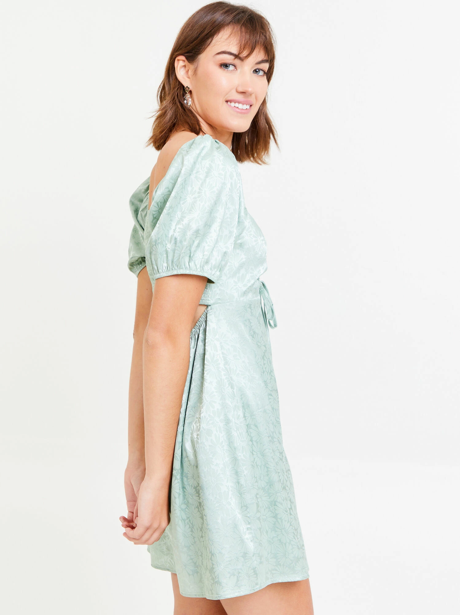 This satin floral daisy dress is the perfect pick for any occasion! The satin feel makes for an elegant feel and the floral pattern adds some fun! The cinch front tie makes for a custom fit every time you wear it!Â