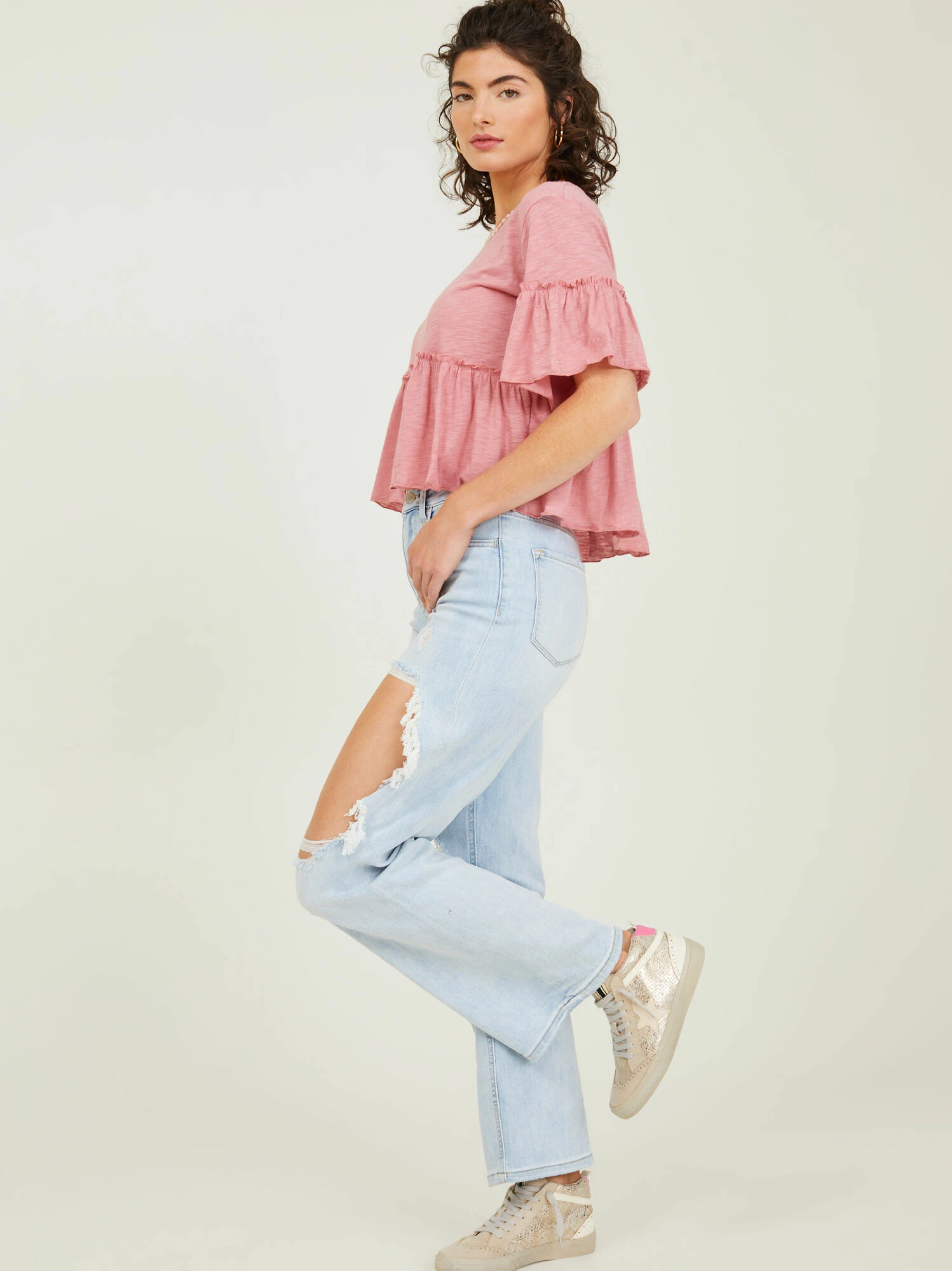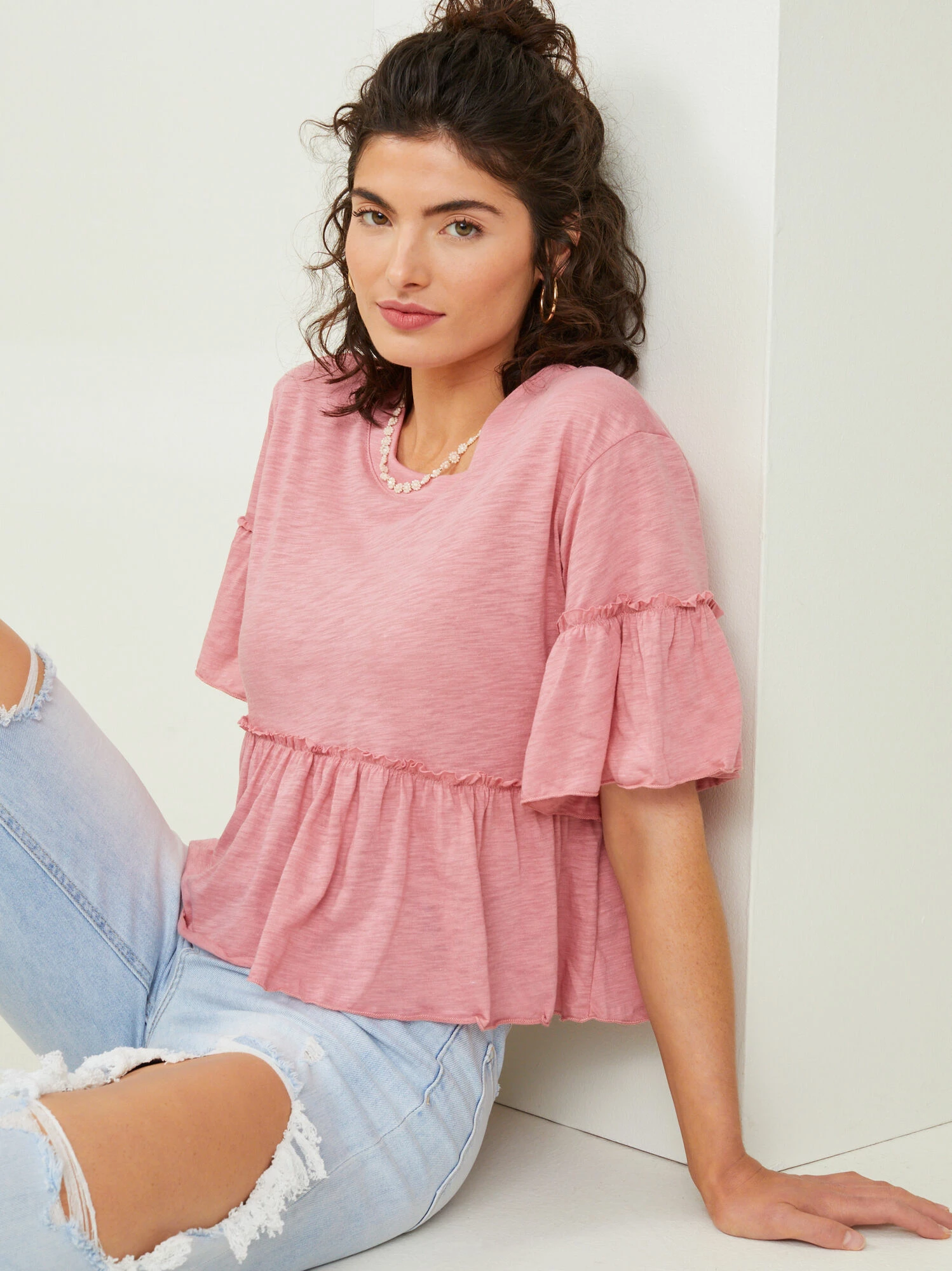 A feminine ruffled top, perfect for casual days. Featuring a soft fabric, rounded neckline, and short sleeves, the Juniper Ruffle Top is the perfect twist on a basic tee!