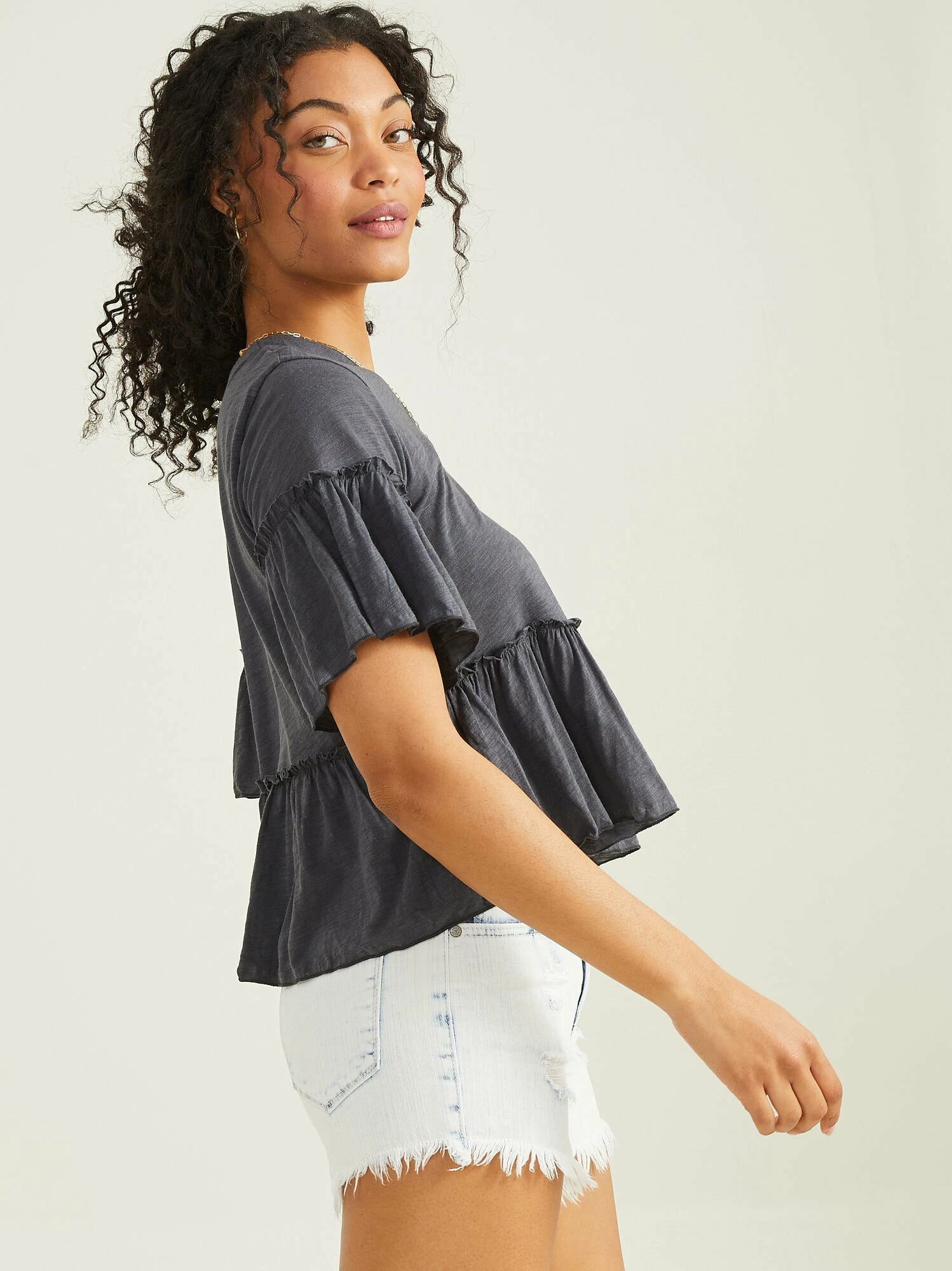 A feminine ruffled top, perfect for casual days. Featuring a soft fabric, rounded neckline, and short sleeves, the Juniper Ruffle Top is the perfect twist on a basic tee!