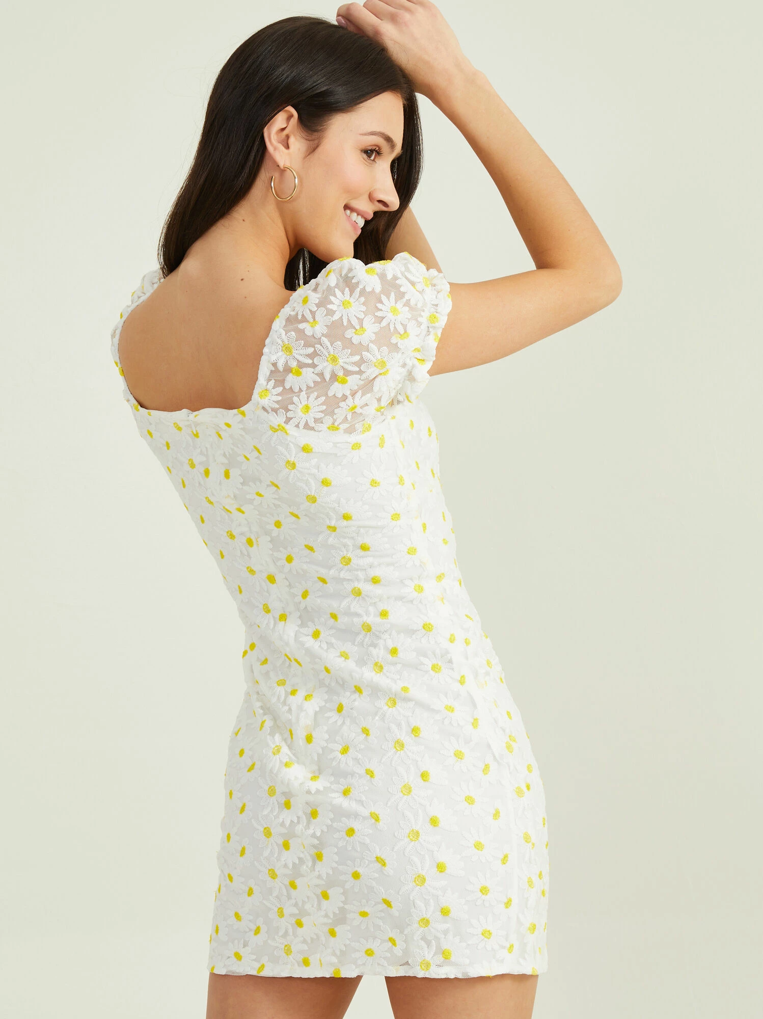 The daisy dress of your dreams, this little mini dress will be your new go-to! The stunning mesh embroidered floral material combined with the exuberant puff sleeves makes for the sweetest dress. Dress it down with white sneakers, or dress it up with heels and your favorite jewelry.