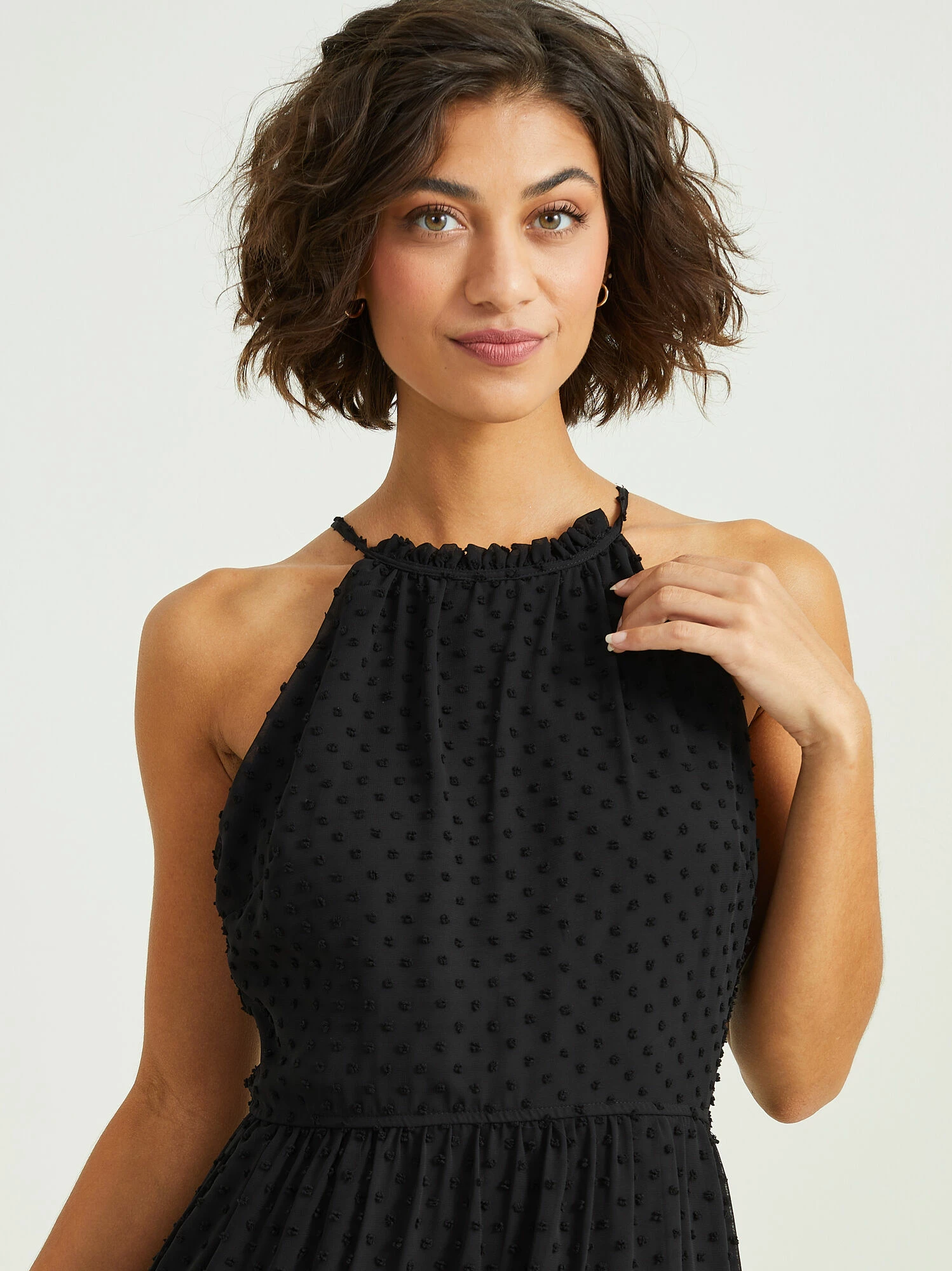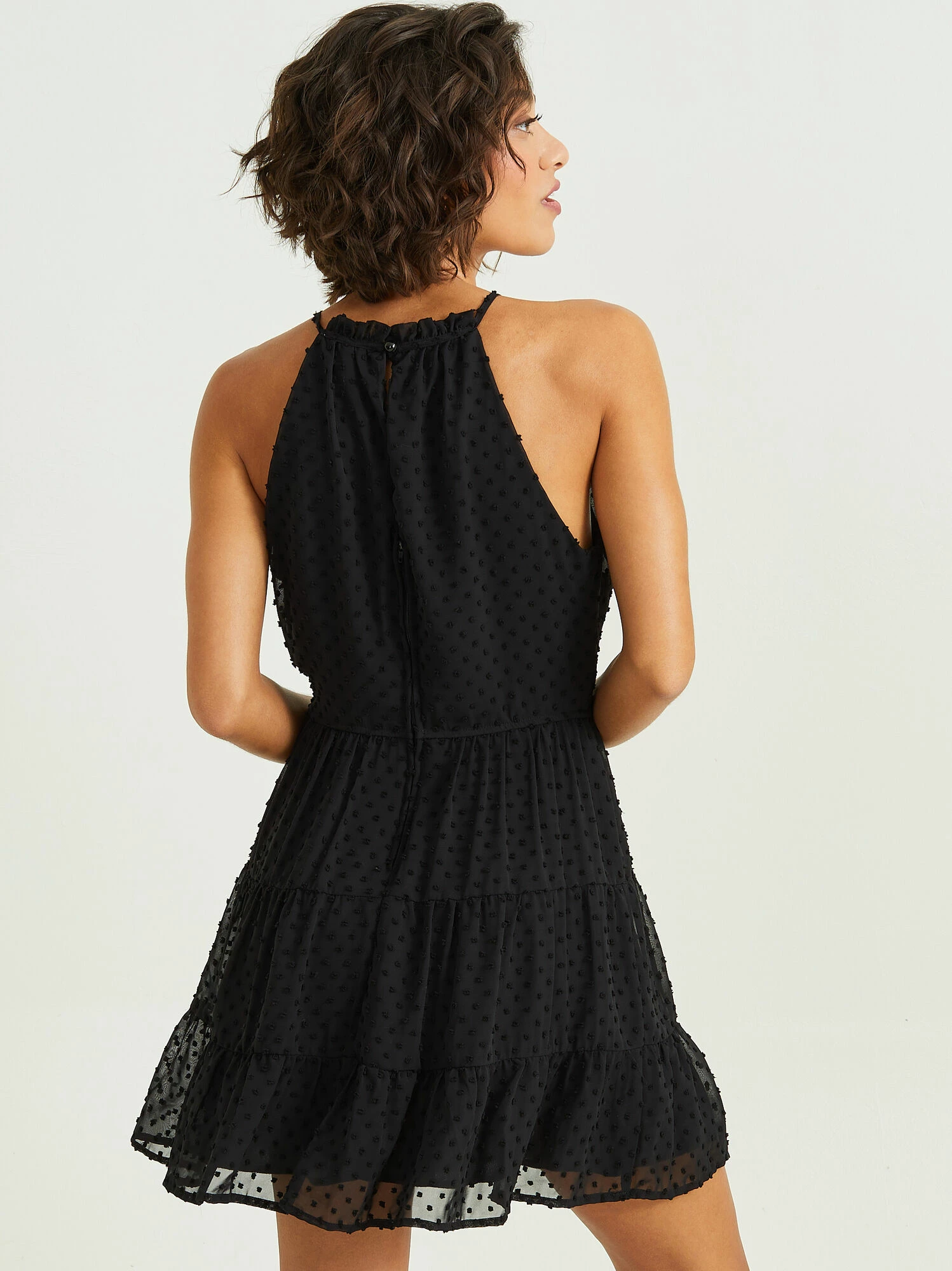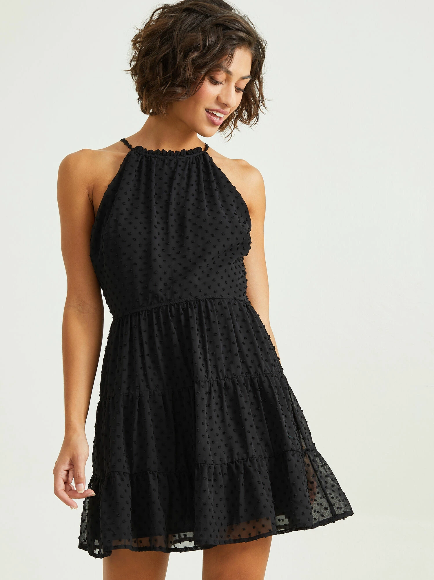 a classic silhouette with a fun texture! this high-neck tiered dress has a polka-dot textured fabric that is so fun and unique! pair with some nude heels for a full look!