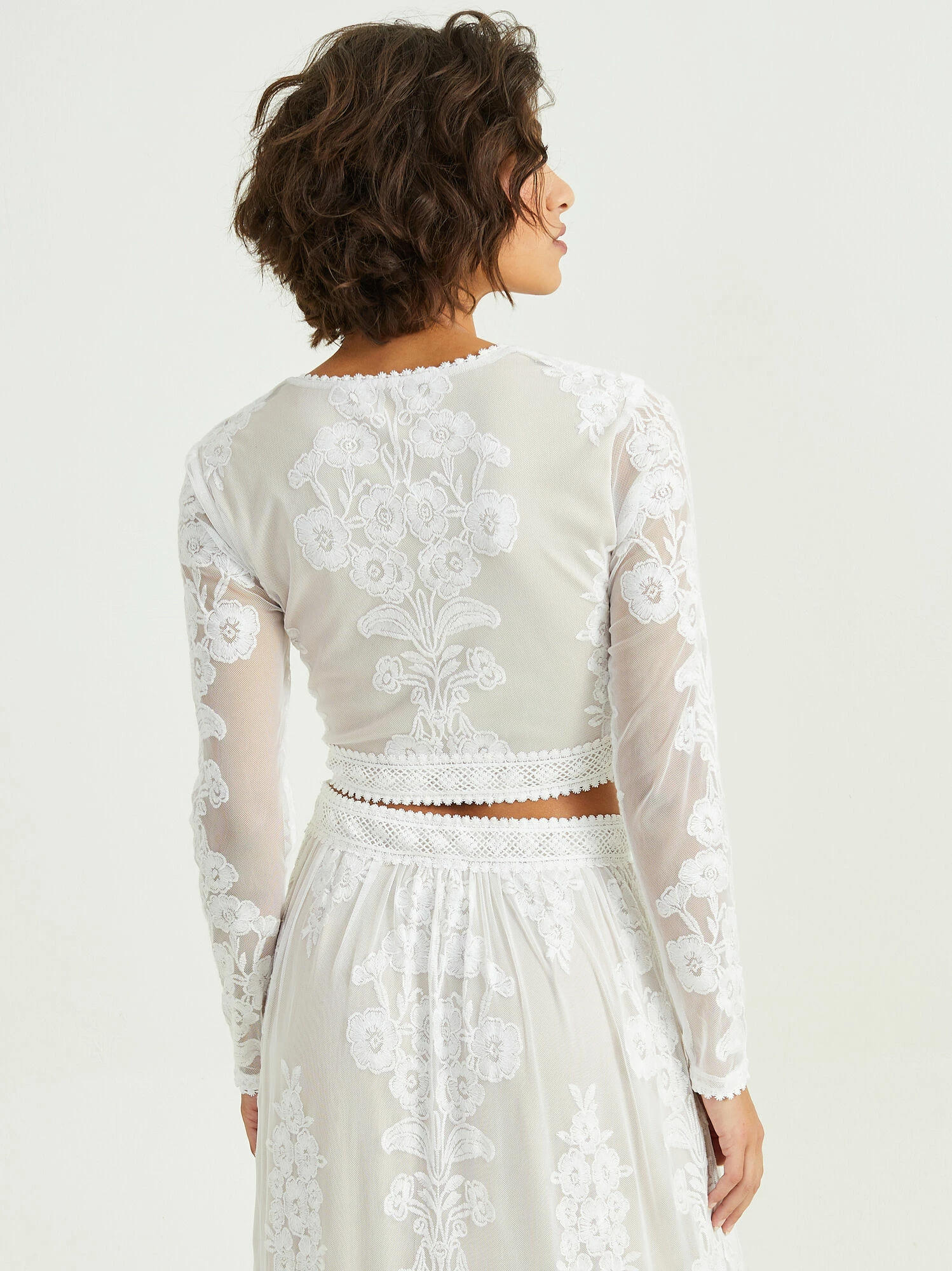 this plunging neckline, floral embroidered and long-sleeve crop is the perfect statement for your closet! grab your favorite delicate necklace, and the matching maude floral maxi skirt for a one-of-a-kind look!