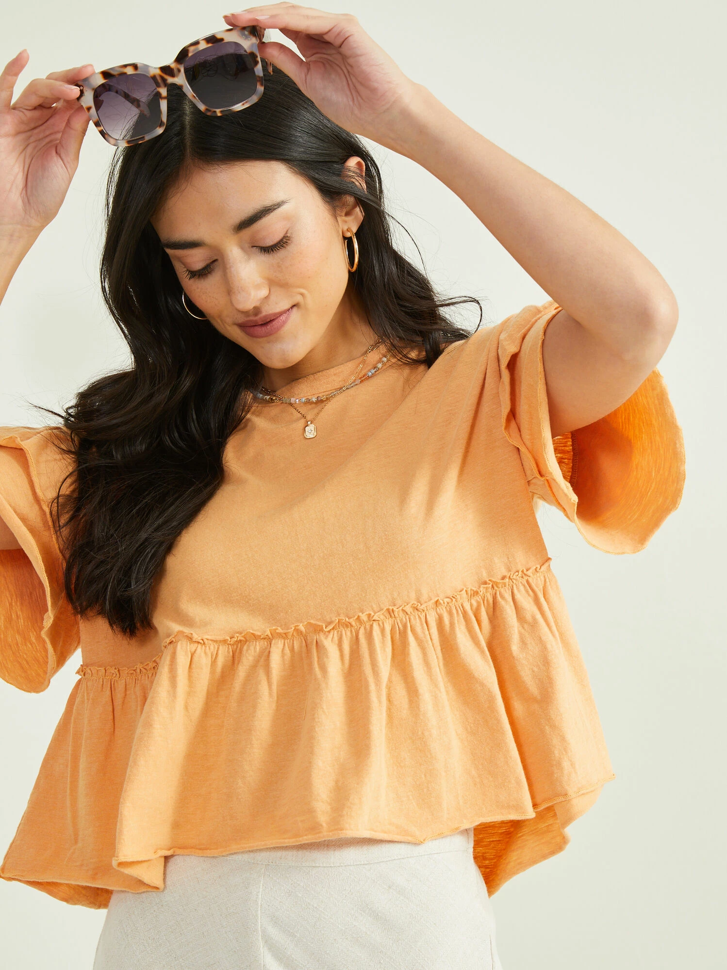 The Nora Ruffle Baby Doll Top will become your new go-to. This super soft baby doll style top features ruffle sleeves for an extra feminine touch. It is comfortable enough to easily throw on and can be dressed up or down. Style this elevated t-shirt with denim and fun sandals for the perfect on-trend look.