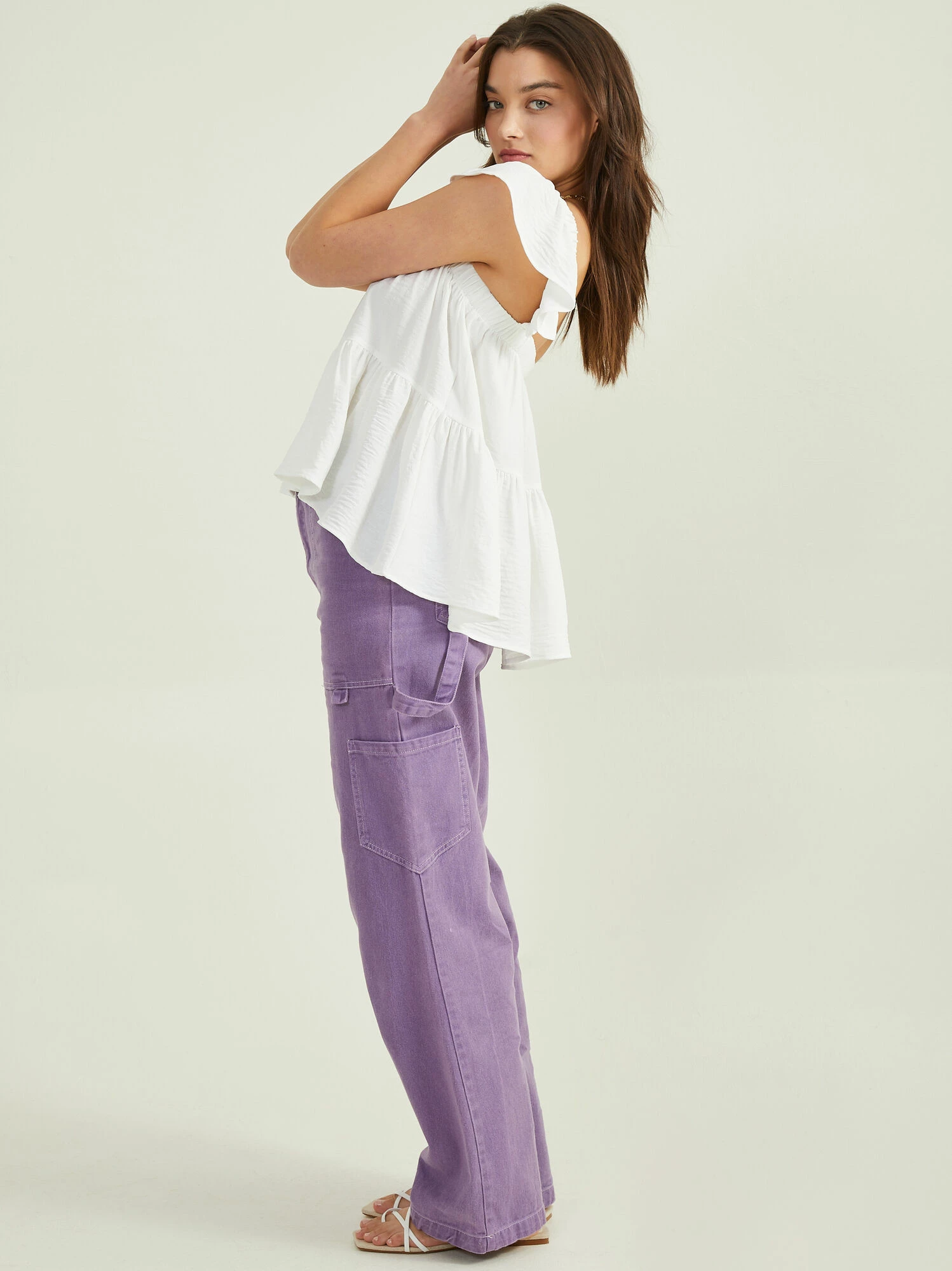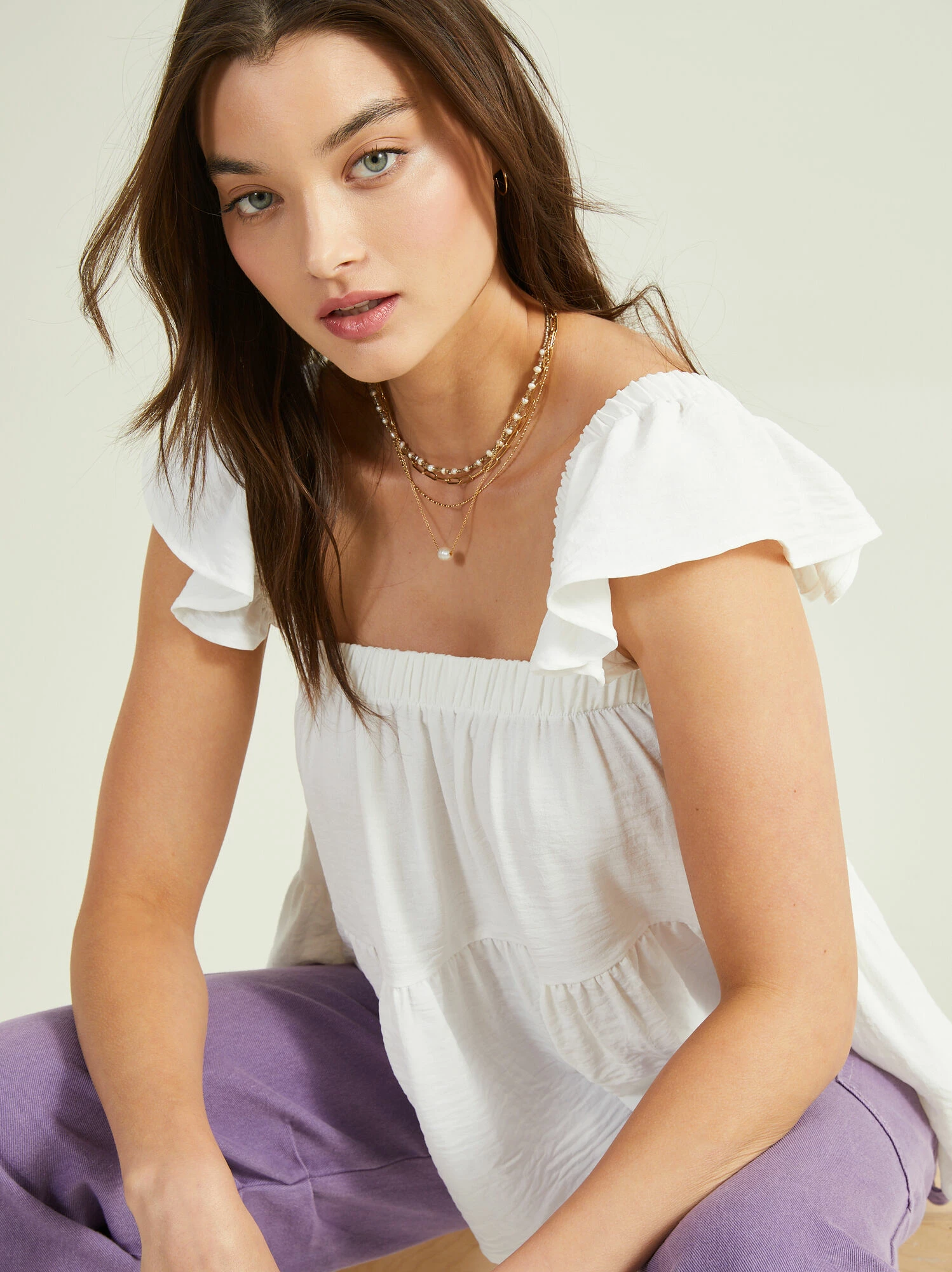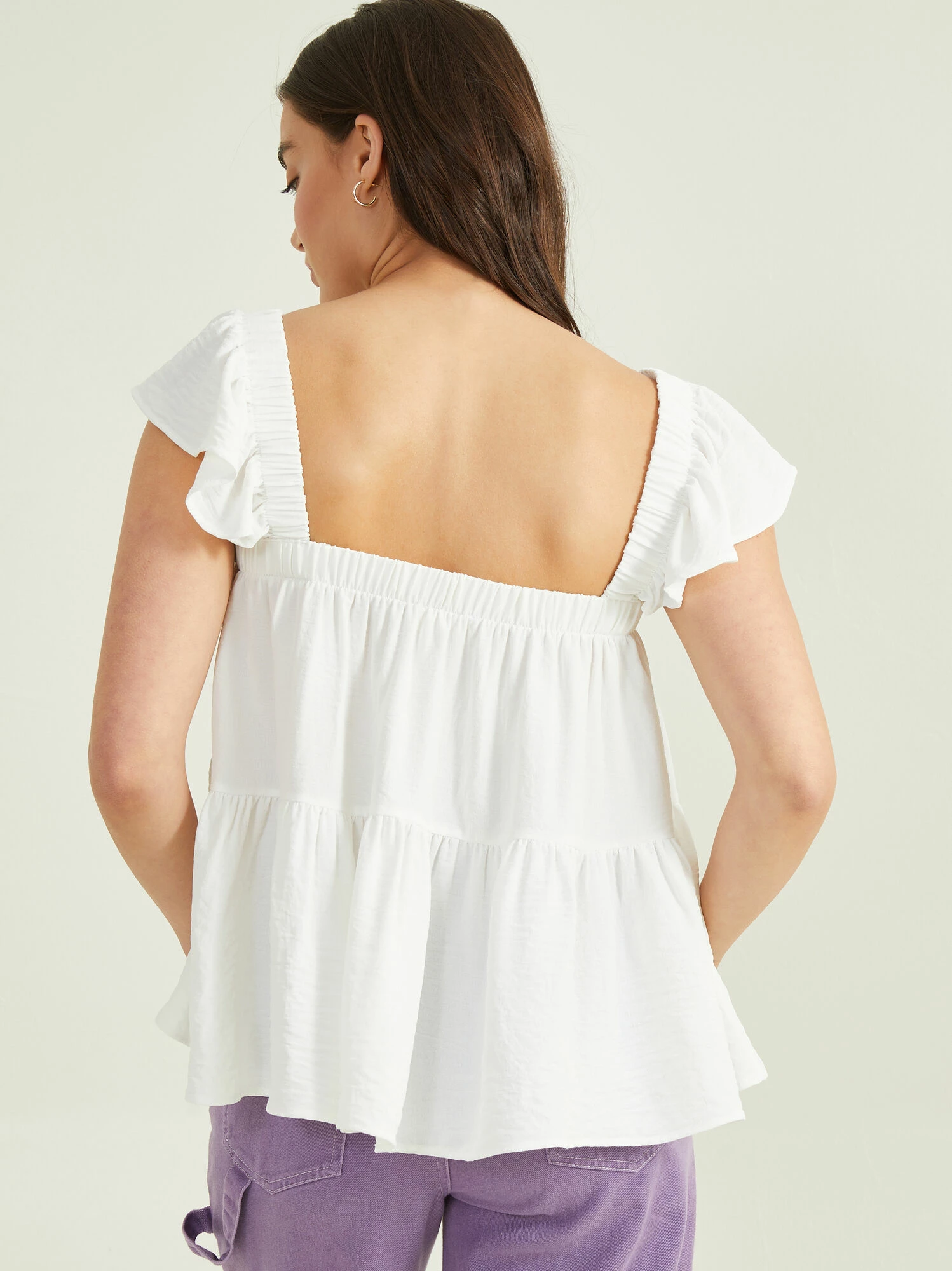The sweet baby doll top is the perfect top to add to your everyday wardrobe. The versatile fit allows it to be dressed up or down, depending on your plans. The elastic neckline and flutter sleeves compliment the tiered top giving it a flirty fun vibe. Pair it with straight-leg jeans and a cute claw clip for an effortlessly stylish and trendy look!
