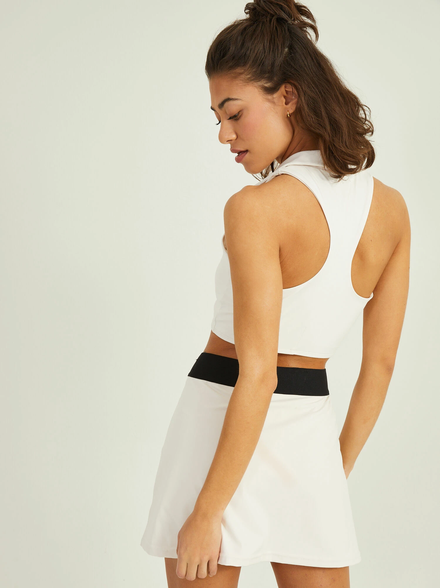 Bring on the preppy girl look with this classy collared style cropped top featuring a v-neckline and razor back. The built in bra and front darts give a flattering fit that will pair perfectly with your all your tennis skirts for the cutest courtside look!