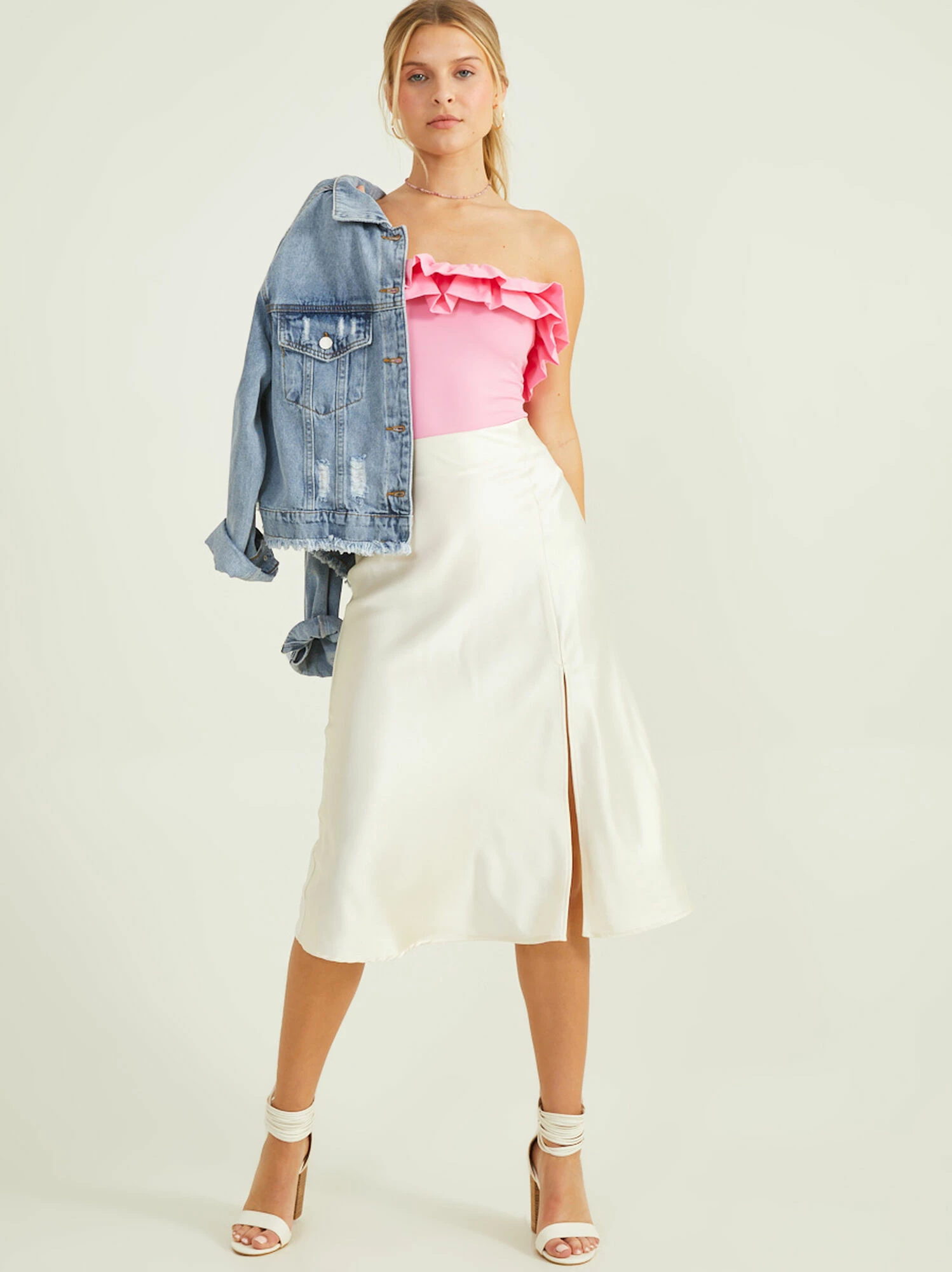 Add a fun and trendy touch to your outfit with the Sunny Poplin Ruffle Bodysuit. This next-level bodysuit features a flirty strapless look and bold poplin ruffles. Pair this top with a pair of jeans and some colorful heels for a bright and fun outfit for the warmer weather!