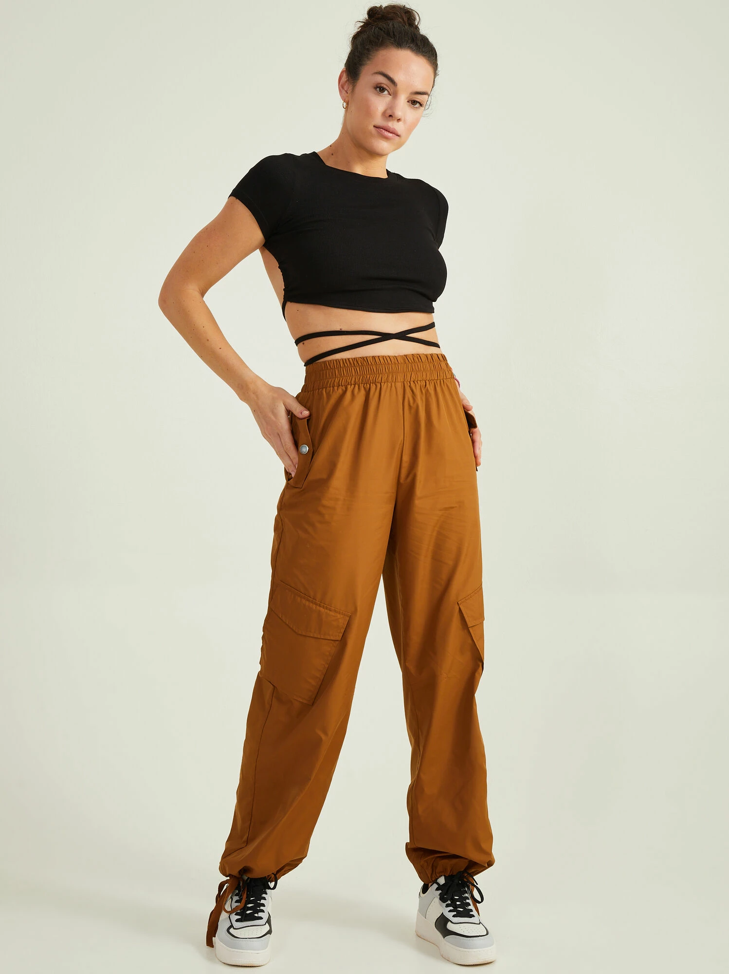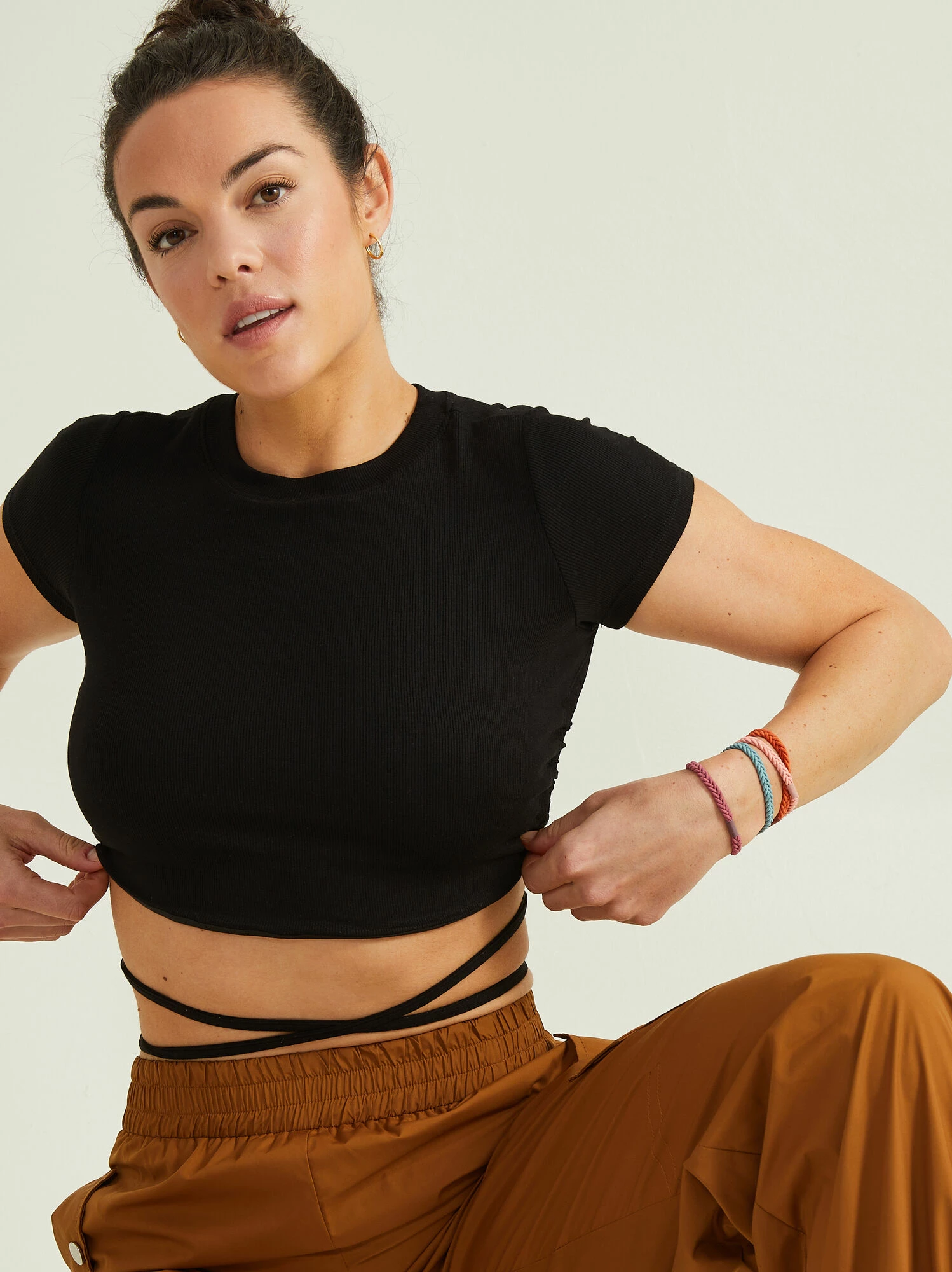 Wrap up your your athleisure look with this ribbed top featuring a cinched circle back design with long ties to wrap and style the way you like to customize your fit! Style this with cargos or parachute pants for the coolest everyday outing fit for all your errands!
