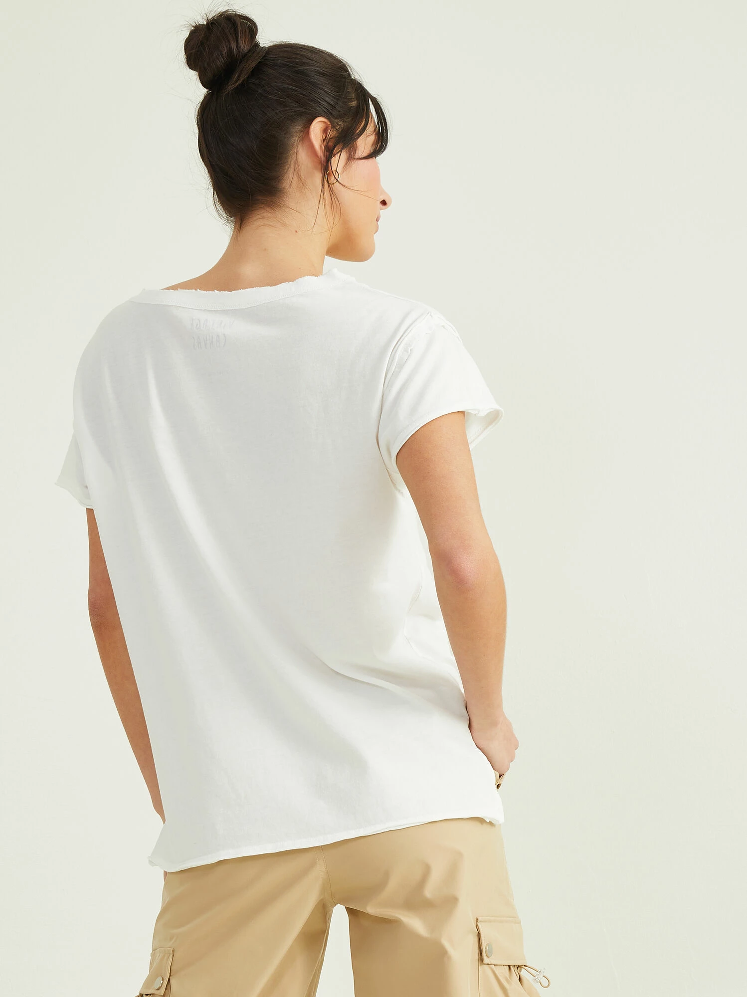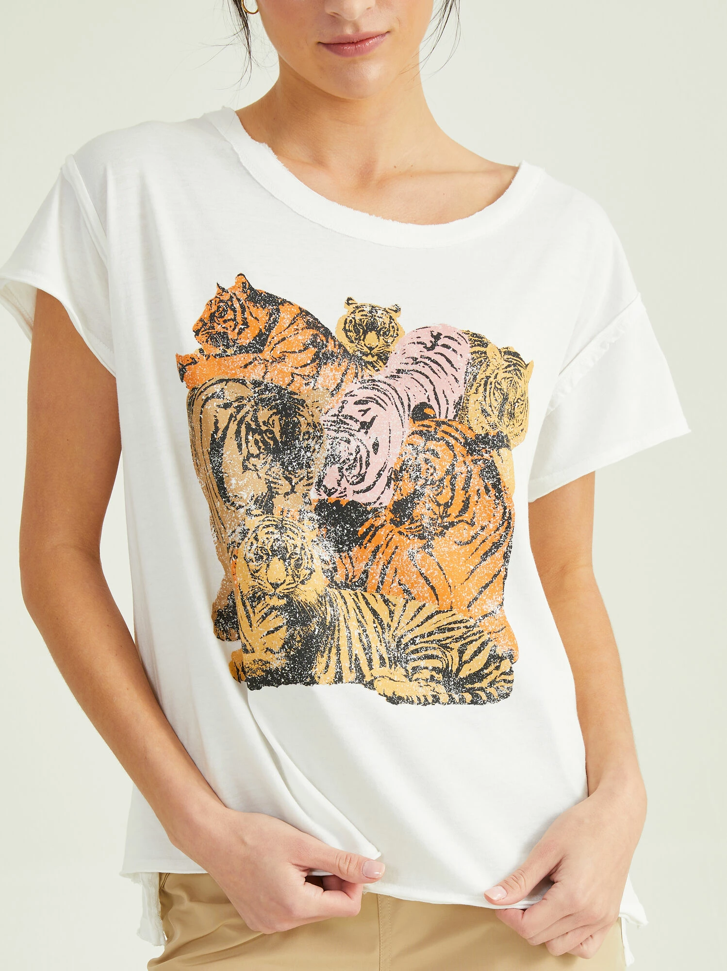 This tiger graphic tee is sure to be your new go-to. The distressed look of the graphic is so on trend and the raw hem gives it a more relaxed look, with a super soft feel. Style with some cargo joggers or parachute pants with a chunky sneaker for a effortless travel fit.