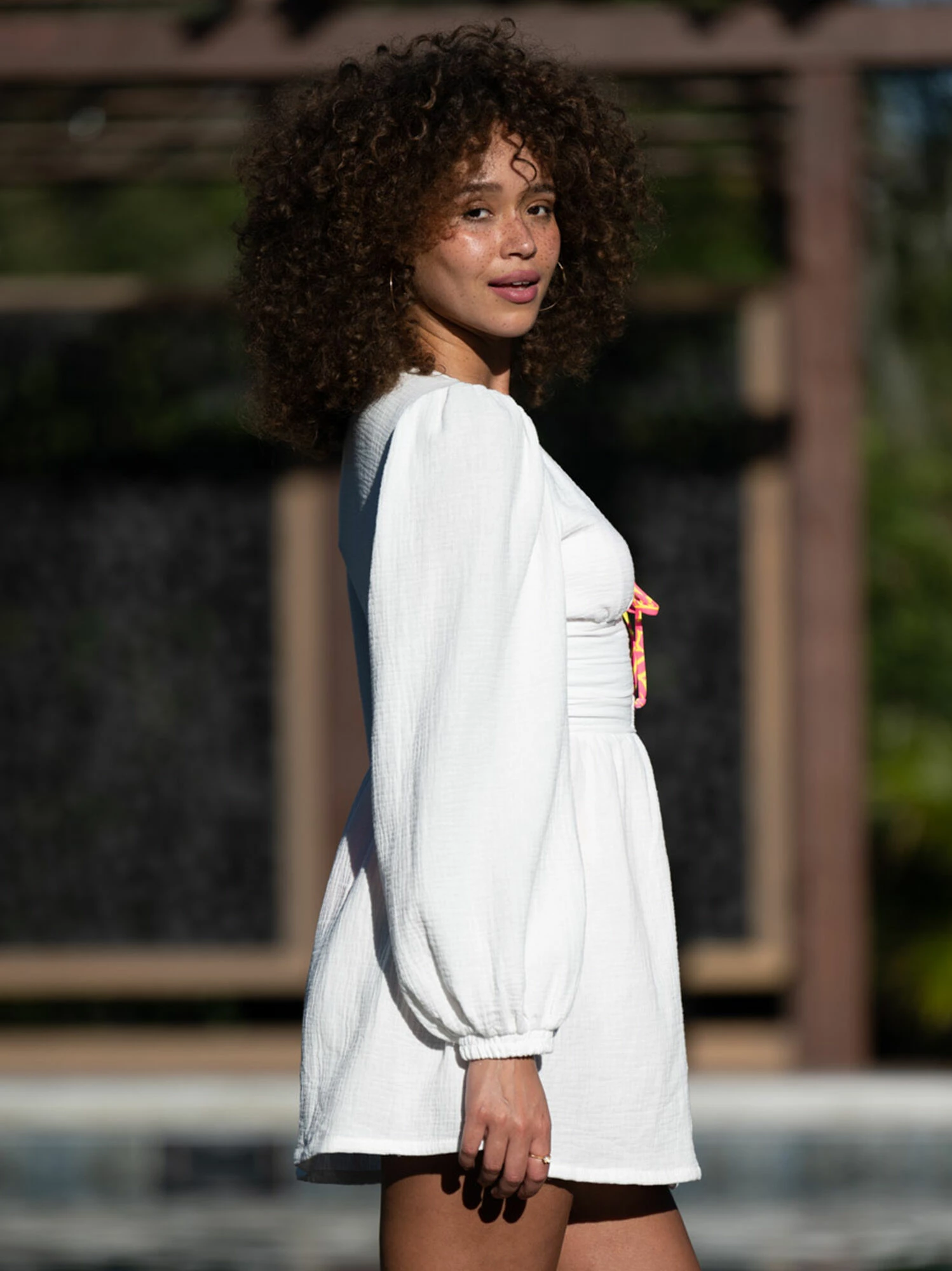 Whether beach or poolside or exploring the town, this Waikiki Gauze Coverup Dress is a perfect choice! This super lightweight mini dress features ballon-style sleeves and cinched waist details. The wide waistband with the button-down style is such a flattering look. Wear this over your swimsuit and effortlessly transition to going out to eat or shopping!