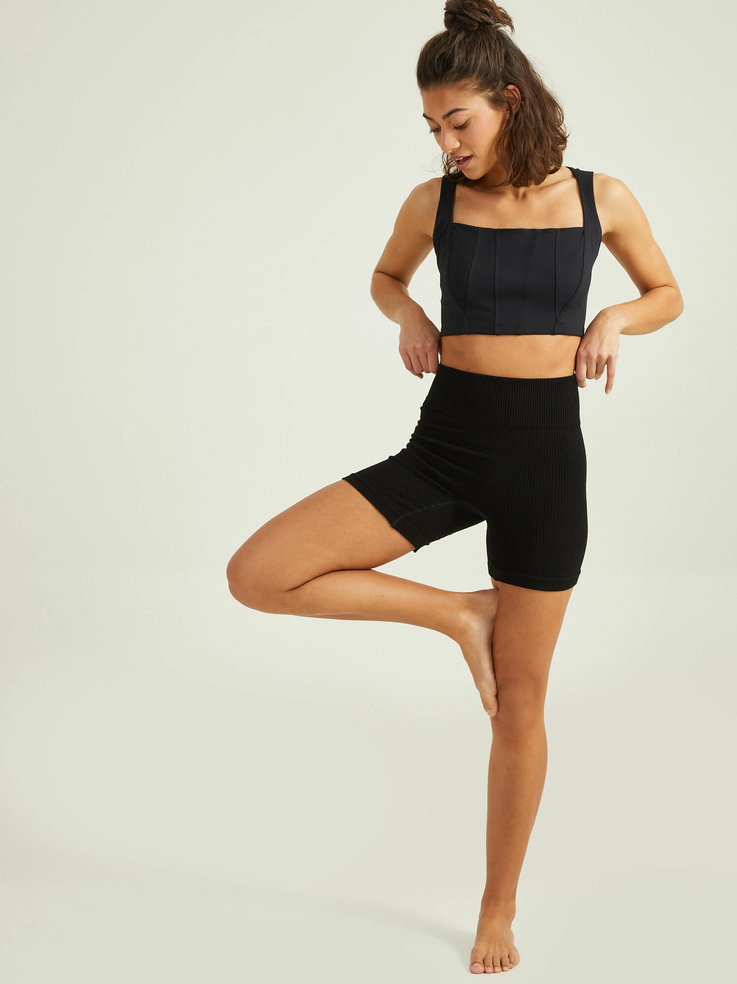 These soft, stretchy biker shorts feature a ribbed fabrication and high waisted fit. Pair with a sports bra or cropped tank for your next studio class or layer under your favorite cargos for an easy airport fit!